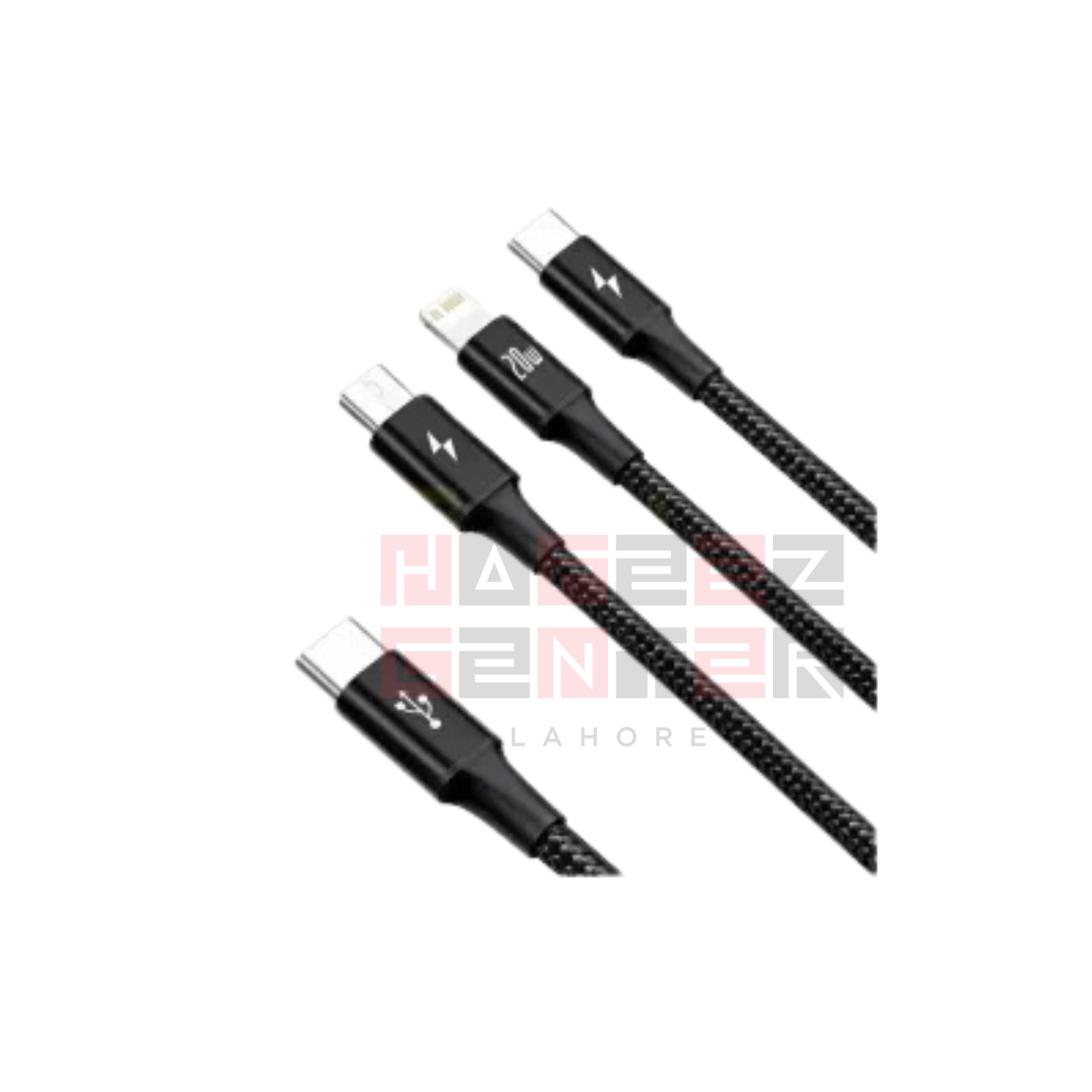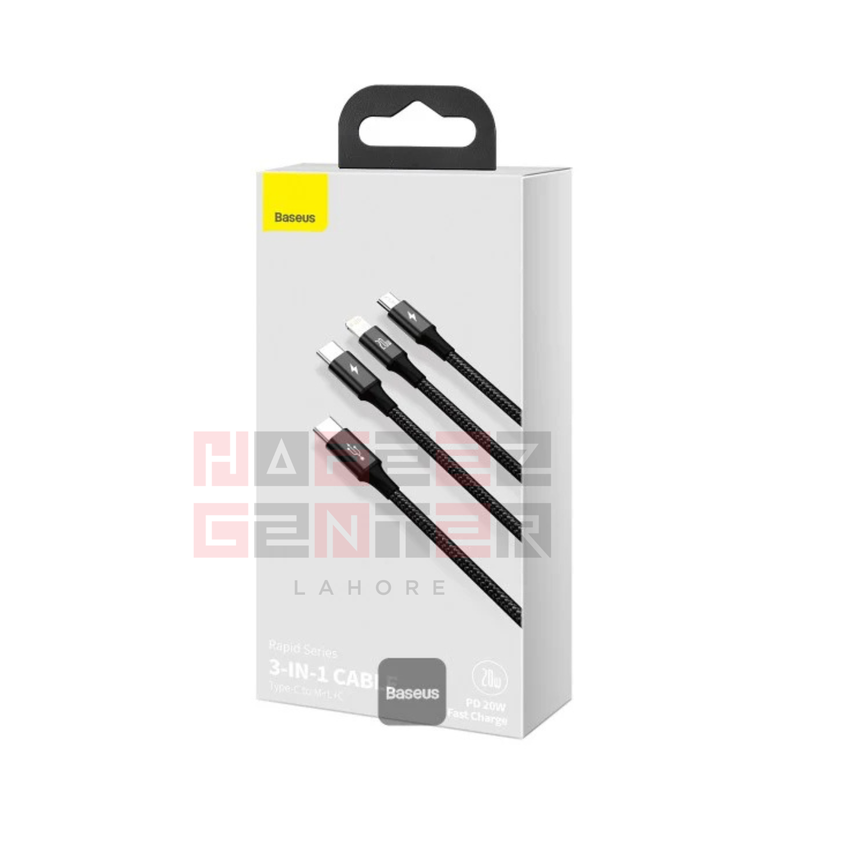 Brand: Baseus, Name: Rapid Series 3-in-1 Fast Charging Data Cable, Model: CAMLT-SC01, Material: Aluminum alloy + braided nylon, Power: PD 20W, compatible with PD 18W, Transmission speed: iP/480MB/s, Input: USB-C, Output: Micro USB + Lightning + USB-C, Color: Black, Length: 1.5m